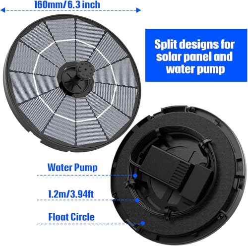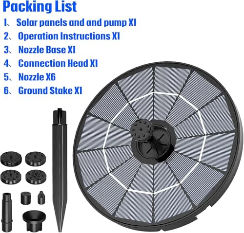| Features | 【DIY Solarbrunnen für Vogelbad Kit】: DIY Solarbrunnen Kit, sorgfältig gefertigt aus hocheffizienten Sonnenkollektoren (2.8W). Sie können die Wasserpumpe und das Solarmodul zusammen in einer Vogeltränke unterbringen, oder Sie können die Pumpe und das Solarmodul trennen und frei kombinieren.Sie können Ihrer Kreativität freien Lauf lassen und frei gestalten. Oder verwenden Sie es mit Ihrem kreativen Brunnen., 【Umweltschutz 2.8W Solar panel】 Es wird komplett mit Solarenergie gesteuert, benötigt weder Batterie noch Strom. Keine Batterie darin, eine wirklich umweltfreundliche Solar Springbrunnen. Legen Sie die Pumpe lediglich ins Wasser, Stellen Sie das Solarpanel auf das direkte Sonnenlicht und es funktioniert automatisch. Eingebauter brushless motor mit längere lebensdauer und geringeren verbrauch., 【Einfach zu bedienen】: Eigenständiger Solarbrunnen. Bewegen Sie sich frei an verschiedene Orte, ohne komplizierte Installation und Wartung, Die Solar-Wasserfontäne kann als Vogelbad-Brunnen und Fischtank-Wasserzirkulationsgerät verwendet werden. Das Kabel zwischen Solarpanel und Pumpe ist lang genug mit einem 1.2 Meter langen Kabel, um einen relativ großen Bereich abzudecken, ohne sich Sorgen machen zu müssen, dass die Pumpe im Schatten nicht funktioniert., 【6 verschiedene Sprühstil】: Verschiedene Düsen können Ihre unterschiedlichen Anforderungen an die Wassersäule Höhe oder Wassersäule Form. Die Höhe kann durch Wechseln der Düsen eingestellt werden, um ein Verschütten aus dem Becken zu vermeiden. Sie können den Sprühkopf leicht wechseln., 【Anti Drift Design】: Der Solar-Vogelbad-Brunnen hat einen versenkbaren Ständer, der für Vogeltränken entwickelt wurde, Verhinderung des Abdriftens von Solarbrunnen. Öffnen Sie den Ständer, die Pumpe kann in der Mitte der Vogeltränke befestigt werden, um ein Abdriften zu vermeiden. |