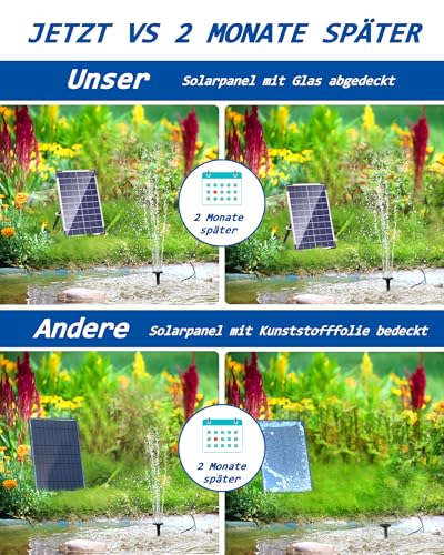 | Features | 【Solarbrunnen für Garten Teich】Diese solar brunnenpumpe läuft, solange das Solarpanel Sonnenlicht empfängt – ideal für miniteich, Gärten wasserspiel, Wasserfälle und mehr. Eine solarpumpe zieht Vögel und Wildtiere an und bringt Schönheit und Freude in Ihre Außen, 【Langlebige Solar Teichpumpe mit Filter】Solar springbrunnen für außen bietet Trockenlaufschutz und Filterwatte. Der Solar Gartenbrunnen pumpe schaltet sich automatisch ab, wenn der Wasserstand zu niedrig wird. Ein Filter verhindert, dass viel schmutziger Abfall in die Pumpe gelangt, 【Mehrere DIY Solar Wasserspiele】Solarsprinbrunnen mit 10 verschiedenen Düsen und Rohren können Sie leicht verschiedene springbrunnen solar und solar wasserspiele erstellen, Dank Schaumstoffpolstern können Solarpumpen in Teiche und Pools jeder Tiefe eingesetzt werden, 【Umweltfreundliches Solarpanel-Set】Das Biling teichpumpe solar nutzt Glas-Solarmodule, die auch bei langfristiger Nutzung im Freien nicht oxidieren. Das Solarpanel absorbiert das Sonnenlicht effizient und sorgt für einen stabilen Wassernebel, 【Tier- und Pflanzenfreundlich】Fließendes, sauberes Wasser lockt Vögel und Wildtiere an. Der solar brunnenpumpe bringt Leben und Schönheit in Ihren Garten oder Hof. 1 Jahr Garantie. Bei Fragen stehen wir Ihnen jederzeit zur Verfügung |