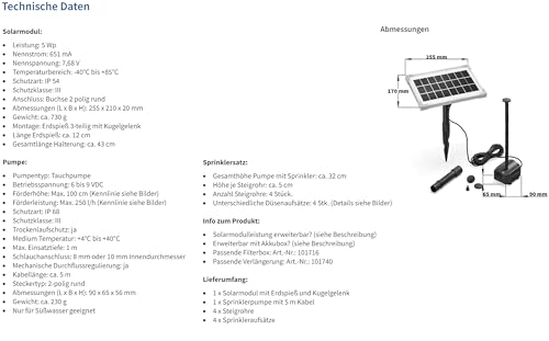 Features | ✅ TEICHPUMPEN-SET MIT SPRINKLER-FONTÄNE, 4 Sprinkler Fontänen Aufsätze werden mitgeliefert. Wasserpumpe ausgelegt für geringe Tiefen. Verwandeln Sie Ihren Garten mit diesem esotec Solar-Teichpumpen-Set in eine Entspannungsoase., ✅ EINFACH & SCHNELL, Dank steckfertiger Komponenten inklusive Teich Pumpe mit 5 m Kabel lässt sich unsere Solar Teichpumpe ohne Werkzeug aufbauen und installieren. Auch bei Wartungsarbeiten kann sie ohne großen Aufwand vollständig zerlegt werden., ✅ EFFIZIENT, Die elektronische Sprinklerpumpe erreicht eine maximale Förderhöhe von 100 cm sowie eine Förderleistung bis zu 250 l/h. Sie hat einen Trockenlaufschutz und arbeitet mit einem energiesparenden 6-9 V/DC Direktbetrieb. Solarmodul: 5 Watt, ✅ LEISTUNGSSTARK, Die Solarpumpe sorgt bei geringer Sonneneinstrahlung für eine zuverlässige Wasserförderung. Für die optimale Leistung, werden die Module der Tauchpumpe mit dem im Lieferumfang enthaltenen Erdspieß direkt Richtung Sonne positioniert., ✅ ESOTEC, Als familiengeführtes Unternehmen legen wir großen Wert auf Qualität und Nachhaltigkeit. Deshalb setzen wir seit über 20 Jahren auf die Entwicklung und Produktion nachhaltiger Solar-Gartendeko Produkte. |