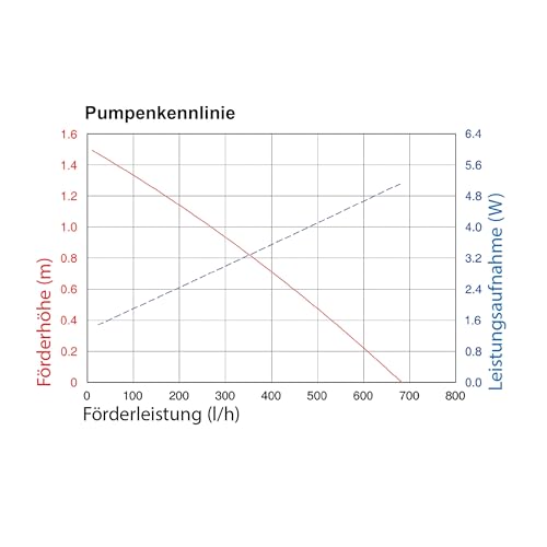 Die leistungsstarke Pumpe fördert bis zu 650 Liter Wasser pro Stunde und erreicht dabei eine Förderhöhe von bis zu 1,4 Meter. Dies ermöglicht beeindruckende Wasserspiele, die sowohl in kleinen als auch in größeren Teichen zur Geltung kommen.