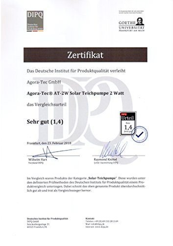 Agora-Tec® AT-2W Solar Teichpumpe 2 Watt Hmax.: 170l/h Fontainenhöhe: 0,65m für Gartenteich oder Springbrunnen