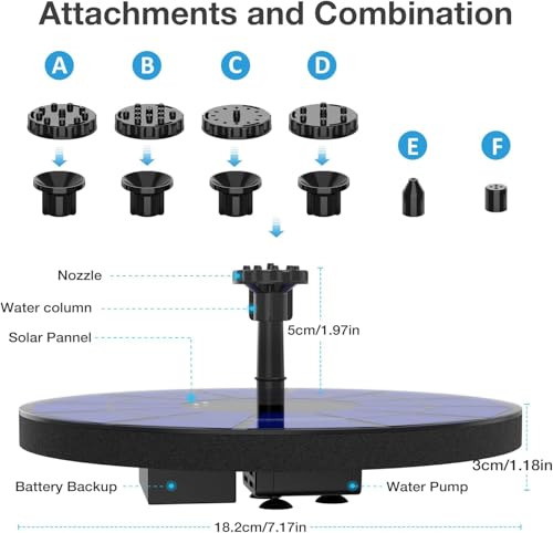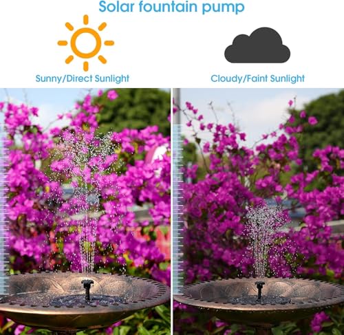| Features | 【3,5W Solar panel】: Diese schwimmende Solarbrunnen wasserpumpe wird auf 3,5W hochwertige Solarpanele erhöht, damit die Wasserpumpe auch bei schwachem Sonnenlicht kontinuierlich arbeiten kann., 【Eingebauter 1500 mAh Batterie】: Diese Solar-Schwimmbrunnen Wasserpumpe eingebaute Batterie, automatische Speicherung von Sonnenenergie, echte grüne Solarwasserpumpe. Es nutzt die Sonnenenergiequelle voll aus, es wird noch für eine Stunde nach Einbruch der Dunkelheit verwendet, was sehr ist umweltfreundlich., 【6 verschiedene Wassersprühgeräte】: 6 verschiedene Düsen können Ihre unterschiedlichen Anforderungen an die Wassersäule Höhe oder Wassersäule Form. Die Höhe kann durch Wechseln der Düsen eingestellt werden, um ein Verschütten aus dem Becken zu vermeiden. Sie können den Sprühkopf leicht wechseln., 【Mehrfachanwendung】: Diese Solarpumpe ist perfekt für Vogelbad, Aquarium, kleinen Teich, Pool, Garten, Wasserkreislauf für Sauerstoff. Ihr Garten würde auf jeden Fall die Aufmerksamkeit der Passanten auf sich ziehen. Lassen Sie Ihren Garten von der Solarwasserpumpe so amüsant dekoriert aussehen., 【Hilfreiche Tipps】: Das Produkt verfügt über einen automatischen Abschaltschutz und stoppt automatisch, wenn es das Wasser verlässt. Längere Lebensdauer. Sie sollten die Pumpe regelmäßig reinigen, um zu verhindern, dass die Pumpe durch Staub verstopft wird. |