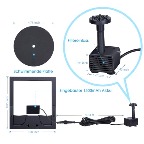 Dank der eingebauten Batterie wird Sonnenenergie effizient gespeichert, sodass die Pumpe auch in den Abendstunden für effektive Beleuchtung und Wasserspiele sorgt. Dies bedeutet mehr Gestaltungsmöglichkeiten für deinen Garten.