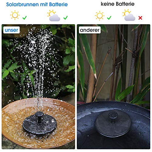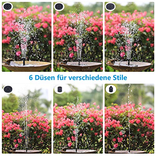 | Features | 【6.5W Solarpanel】 Diese schwimmende Solarbrunnen-Wasserpumpe ist ein Upgrade auf 6.5W hochwertige Solarpanele. Sie ermöglicht es der Wasserpumpe, kontinuierlich zu arbeiten, selbst wenn das Sonnenlicht schwach ist., 【Umweltfreundliche Batterie】 Diese Solar-Schwimmbrunnen Wasserpumpe eingebaute Batterie, automatische Speicherung von Sonnenenergie, echte grüne Solarwasserpumpe. Es nutzt die Sonnenenergiequelle voll aus, es wird noch für 2.5 Stunde nach Einbruch der Dunkelheit verwendet, was sehr ist umweltfreundlich., 【6 verschiedene Wassersprühgeräte】6 verschiedene Düsen können Ihre unterschiedlichen Anforderungen an die Strahlhöhe oder Strahlform erfüllen. Die Höhe kann durch Wechseln der Düsen eingestellt werden, um ein Verschütten aus dem Becken zu vermeiden. Sie können den Sprühkopf leicht wechseln., 【Mehrfachanwendung】 Diese Solarpumpe ist perfekt für Vogelbad, Aquarium, kleinen Teich, Pool, Garten, Wasserzirkulation für Sauerstoff. Ihr Garten würde auf jeden Fall die Aufmerksamkeit der Passanten auf sich ziehen. Lassen Sie Ihren Garten von der Solarwasserpumpe so amüsant dekoriert aussehen., 【Hilfreiche Tipps】 Das Produkt verfügt über einen automatischen Abschaltschutz und stoppt automatisch, wenn es das Wasser verlässt. Längere Lebensdauer. Sie sollten die Pumpe regelmäßig reinigen, um zu verhindern, dass die Pumpe durch Staub verstopft wird. |