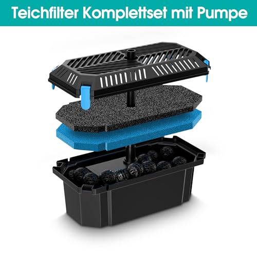 Das integrierte Filtersystem ist sehr effizient und filtert Schmutz sowie Schwebstoffe zuverlässig aus dem Wasser. Der Einsatz von organischen Materialien schützt die Teichbewohner und sorgt gleichzeitig für eine konstante Wasserqualität.