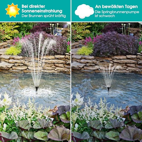 | Features | DIY SOLAR BRUNNENPUMPEN FILTERPUMP: Enthält Solarpanel, Filterkit und Wasserpumpe. Die Springbrunnenpumpe wird mit Solarenergie betrieben und kann fast überall im Freien verwendet werden. Sie können dieses Set verwenden, um Ihre Wasserspiele und Springbrunnen zu bauen, und es reinigt das Wasser, während es eine Wasserzirkulation herstellt, TEICHFILTERKASTEN: Ein Filterset bestehend aus einem Schwamm, einem organischen Oberflächenelement und einem Bio-Pur-Filterstein, der effektiv Schmutz und Schwebstoffe aus dem Wasser filtert und so für klares und gesundes Wasser in Ihrem Gartenteich sorgt. Für Pflanzen und Teichbewohner wie Goldfische sind sie ungefährlich, VIELSEITIG VERWENDBAR: Dieses Solar filterpump hat eine Funktion zum Reinigen von Wasser, hält Ihren kleinen Teich sauber, zieht Vögel an und liefert frisches Wasser für Fische und Schildkröten. Es kann auch Wasserspiele mit sauberem fließendem Wasser versorgen. Hinweis: Es ist nicht für Vogelbäder geeignet, EINFACH ZU VERWENDEN: Dies ist ideal, um einen Wasserkreislauf im Freien einzurichten. Der Filterkasten kann Verunreinigungen im Wasser effektiv filtern, sodass die regelmäßige Wartungszeit des Wasserpumpen-Kits um das 3- bis 5-fache verlängert werden kann, 1 JAHR GARANTIE: Mit einem Solar-Teichfilter mit Springbrunnen stellen Sie sicher, dass Ihr kleiner Teich über eine hochwertige Wasserquelle verfügt. Fügen Sie Ihrem Garten noch heute ein wunderschönes Wasserspiel hinzu |