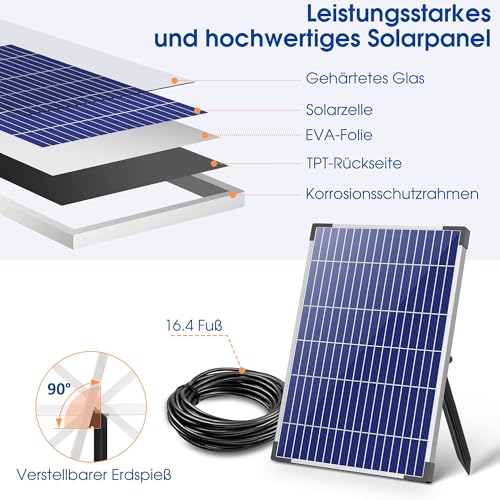 - Einfach zu installieren mit 5 m Kabel und flexibel positionierbarem Solarpanel