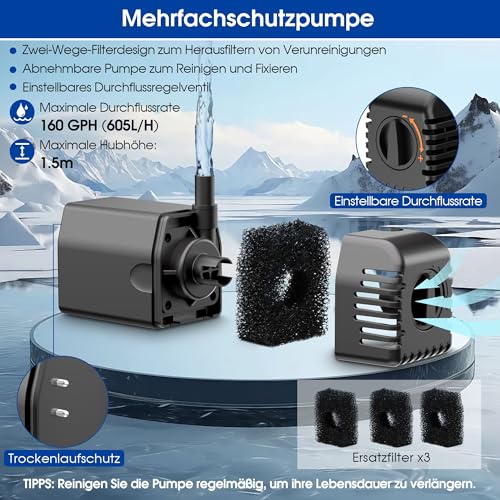 - Ausgestattet mit Trockenlaufschutz und Filter für einen stabilen Betrieb