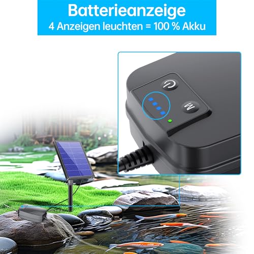 | Features | SOLARTEICHBELÜFTER FÜR DEN AUSSENBEREICH: Arbeitet mit Solarenergie, keine Kabel müssen angeschlossen werden, was für Ihre Fische und Hydrokulturpflanzen sicher ist. Unsere Solarluftpumpe ist für Fischteiche, Aquarien, Fischtransport, Wildfischen und Hydrokulturen geeignet, 3 MODI: starker Schaummodus/milder Schaummodus/10S-EIN/AUS-Modus, um alle Ihre Bedürfnisse besser zu erfüllen. Betriebszeit nach vollständiger Aufladung: 18–36 Stunden. Wenn nicht genügend Sonnenlicht vorhanden ist, wählen Sie bitte den 10S-EIN/AUS-Modus, BATTERIE-STROMANZEIGE: Verbesserte Solarluftpumpe, ausgestattet mit einer Batteriestromanzeige, zeigt die Leistung deutlich an (4 blaue Lichter zeigen volle Ladung an). Die Solarbelüftungspumpe verfügt über eine eingebaute 4400-mAh-Batterie-Notstromversorgung. Lädt sich wieder auf und liefert Solarenergie zum Betrieb der Luftpumpe, LEISTUNGSSTARKERE SOLARLUFTPUMPE: Verwenden Sie ein Glas-Solarpanel, das die Effizienz der Umwandlung von Solarenergie und ihre Lebensdauer erhöht. Die Luftleistung, Wasserdichtigkeit und Geräuschentwicklung der Luftpumpe sind ebenfalls optimiert. Dieses Solar-Teichbelüfter-Set eignet sich gut für Ihren Teich, GARANTIE UND EINFACHE MONTAGE: Die Solar-Springbrunnenpumpe von Biling bietet 1 Jahr Garantie. Bei Problemen mit der Solar-Luftpumpe lassen Sie es uns bitte wissen, wir helfen Ihnen weiter |