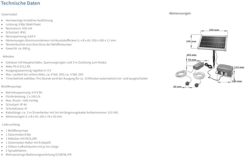 | Features | SOLAR TEICHBELÜFTUNG SET, Der Teichbelüfter 8/200 sorgt für eine effektive Sauerstoffzufuhr in Ihrem Gartenteich, ganz ohne Stromanschluss. Der Teichbelüfter ist für große wie für kleine Teiche geeignet., VERLÄNGERTE LAUFZEIT, Betrieb auch ohne Sonnenschein durch den mitgelieferten Stromspeicher Akku (Pb 6V/3,2Ah). Timerbetrieb wählbar: Pro Stunde wird der Ausgang für ca. 10 Minuten automatisch ein-/ ausgeschaltet. Spannungsregler für Leistungsanpassung., EFFIZIENT, Gerade an heißen Sommertagen kann ein Mangel an Sauerstoff das biologische Gleichgewicht der Teiche stören. Die Sauerstoffpumpe schafft über 100l/h Luftleistung pro Ausgang und hilft den Sauerstoffgehalt zu erhöhen. Solarmodul: 8 Watt, EINFACHE INSTALLATION, Den Luftschlauch mit Luftausströmer am Auslass der Luftpumpe / Sauerstoffpumpe anstecken. Solarmodul und Garten-Teich-Luftpumpe verbinden und an der gewünschten Stelle am Teich platzieren. 5m Anschlusskabel enthalten., ESOTEC, Als familiengeführtes Unternehmen legen wir großen Wert auf Qualität und Nachhaltigkeit. Deshalb setzen wir seit über 19 Jahren auf die Entwicklung und Produktion nachhaltiger Solar-Gartendeko Produkte. |
