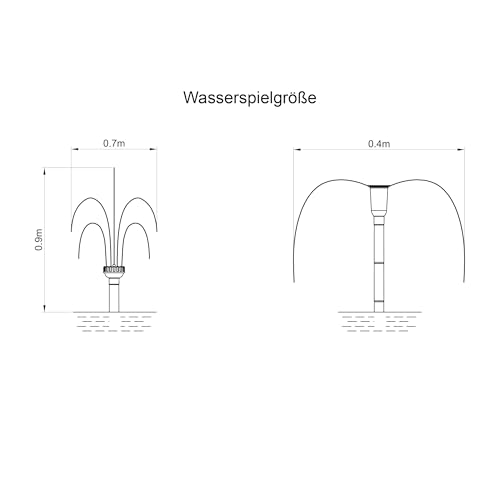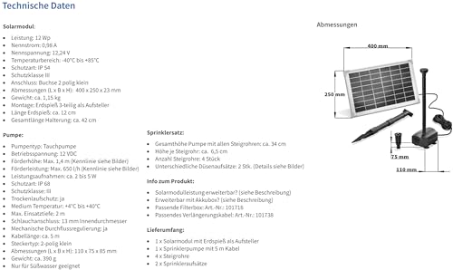 | Features | ✅ TEICHPUMPEN-SET PUMPENSYSTEM, 2 Wasserspiel-Fontänen-Aufsätze mit 2 unterschiedlichen Spritzbildern. Perfekt für Gartenteiche, Schalen, Brunnen, größere Wasserbehältnisse., ✅ DIREKTBETRIEB, Sobald genügend Sonnenstrahlen auf das Solarmodul treffen beginnt die Tauchpumpe Wasser zu fördern. Der elektronische Antrieb der Solar Teichpumpe sorgt dabei für Langlebigkeit und Zuverlässigkeit., ✅ EFFIZIENTE PUMPE, Förderhöhe max. 1,4m (abhängig vom Sprinkleraufsatz), Förderleistung max 650l/h, Abm. (LxBxH) 110x75x85mm, IP68. Nur für Süßwasser geeignet. Trockenlaufschutz: ja. Kabellänge 5m, Schlauchanschluss Innen-ø: 13mm, ✅ LEISTUNGSSTARK, Die Solarpumpe sorgt für eine zuverlässige Wasserförderung. Für die optimale Leistung wird das Solarpanel (12,24V/DC, 12 Watt) Richtung Sonne ausgerichtet und beginnt das Wasser-Plätscher-Spiel., ✅ ESOTEC, Als familiengeführtes Unternehmen legen wir großen Wert auf Qualität und Nachhaltigkeit. Deshalb setzen wir seit über 20 Jahren auf die Entwicklung und Produktion nachhaltiger Solar-Gartendeko Produkte. |