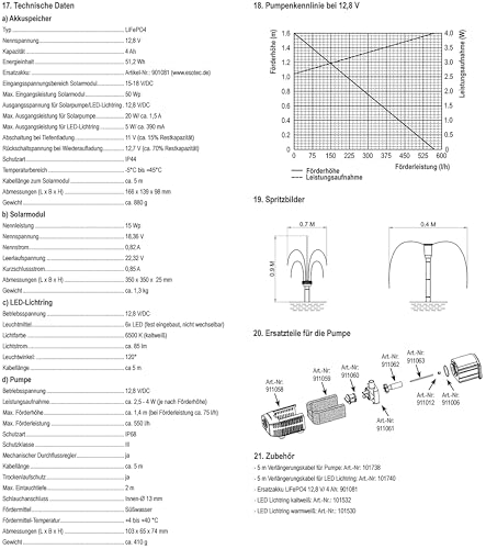| Features | ✅ TEICHPUMPEN-SET MIT SPRINKLER-FONTÄNE, Mehrstrahldüse, Wasserglocke, LED Lichtring. Wasserpumpe ausgelegt für kleinere bis mittlere Gartenteiche. Verwandeln Sie Ihren Garten mit diesem esotec Solar-Teichpumpen-Set in eine Entspannungsoase., ✅ LiFePO4 AKKUSPEICHER: Betrieb auch ohne Sonnenschein durch den mitgelieferten Stromspeicher Akku (LiFePo4 12,8V/4Ah). Hohe Zyklenfestigkeit und hoher Ladewirkungsgrad. Austauschbar. Laufzeit bis 15 Stunden., ✅ EFFIZIENT, Die elektronische Sprinklerpumpe IP68 erreicht eine maximale Förderhöhe von 1,4 m sowie eine Förderleistung bis zu 550 l/h. Sie hat einen Trockenlaufschutz. LED Ring enthalten für wunderschönes Wasser-Lichtspiel. Solarmodul: 15 Watt, ✅ LEISTUNGSSTARK, Die Solarpumpe sorgt für eine zuverlässige Wasserförderung. Für die optimale Leistung, werden die Module mit dem im Lieferumfang enthaltenen Erdspieß direkt Richtung Sonne positioniert., ✅ ESOTEC – Als familiengeführtes Unternehmen legen wir großen Wert auf Qualität und Nachhaltigkeit. Deshalb setzen wir seit über 20 Jahren auf die Entwicklung und Produktion nachhaltiger Solar-Gartendeko Produkte. |