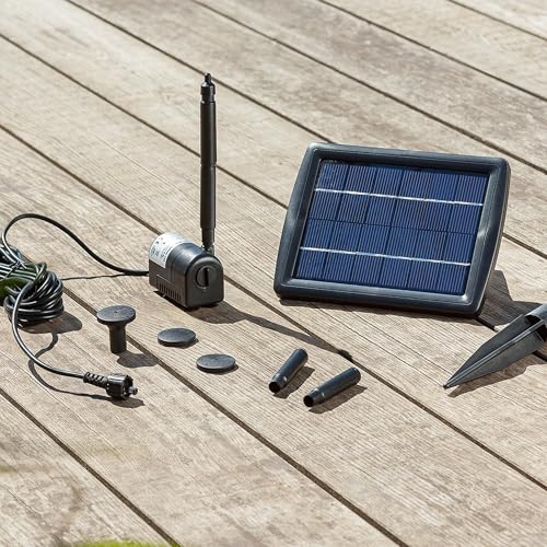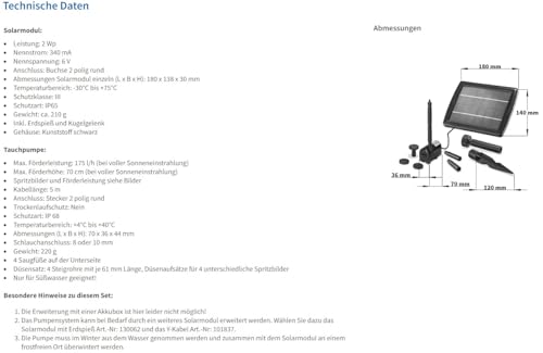 | Features | ✅ TEICHPUMPEN-SET WATERSPLASH, 4 Wasserspiel-Fontänen-Aufsätze. Perfekt für kleinere Gartenteiche, Schalen, Brunnen und Wasserspiele. Verwandeln Sie Ihren Garten in eine Entspannungsoase., ✅ DIREKTBETRIEB, Sobald genügend Sonnenstrahlen auf das Solarmodul treffen beginnt die Pumpe Wasser zu fördern. Der elektronische Antrieb der Solar Teichpumpe sorgt dabei für Langlebigkeit und Zuverlässigkeit. Wasserdurchfluss einstellbar., ✅ EFFIZIENTE PUMPE, Die Solar-Wasserpumpe IP68 erreicht eine maximale Förderhöhe von 0,7m sowie eine Förderleistung bis zu 175 l/h. Trockenlaufschutz: nein, Schlauchanschluss 8 oder 10 mm, Anschluss: Stecker 2-polig, Kabellänge 5m., ✅ LEISTUNGSSTARK, Die Solarpumpe sorgt für eine zuverlässige Wasserförderung. Für die optimale Leistung wird das Solarpanel (6V/DC, 340 mA, 2 Watt) mit dem im Lieferumfang enthaltenen Erdspieß direkt Richtung Sonne positioniert., ✅ ESOTEC, Als familiengeführtes Unternehmen legen wir großen Wert auf Qualität und Nachhaltigkeit. Deshalb setzen wir seit über 20 Jahren auf die Entwicklung und Produktion nachhaltiger Solar-Gartendeko Produkte. |