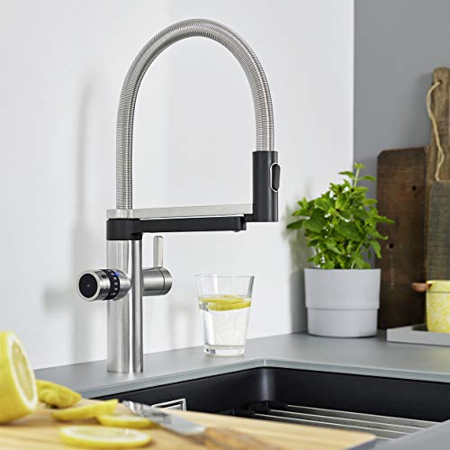 Der Wasserhahn besticht durch sein elegantes Edelstahl-Design, das nicht nur modern aussieht, sondern auch robust und langlebig ist. Er lässt sich mühelos in verschiedene Küchenstile integrieren und sorgt für einen optischen Hingucker.