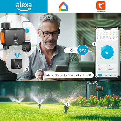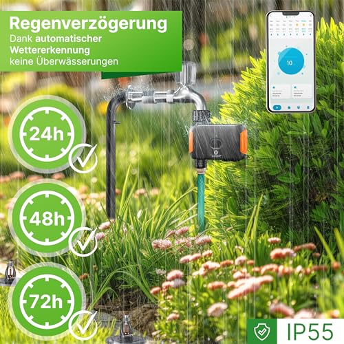 | Features | 𝐈𝐍𝐍𝐎𝐕𝐀𝐓𝐈𝐕𝐄𝐑 𝟑𝟔𝟎° 𝐃𝐑𝐄𝐇𝐁𝐀𝐑𝐄𝐑 𝐀𝐍𝐒𝐂𝐇𝐋𝐔𝐒𝐒: Der Bewässerungscomputer von KESSER ist mit einem revolutionären 360° drehbaren Anschluss ausgestattet, der eine maximale Flexibilität bei der Installation bietet. Egal, ob Sie ihn an einen Wasserhahn, einen Schlauch oder einen Wasserbehälter anschließen möchten, dieses innovative Merkmal gewährleistet eine mühelose Anpassung an jede Situation., 𝐇𝐎𝐂𝐇𝐖𝐄𝐑𝐓𝐈𝐆𝐄𝐑 𝐔𝐍𝐃 𝐋𝐀𝐍𝐆𝐋𝐄𝐁𝐈𝐆𝐄𝐑 𝐅𝐈𝐋𝐓𝐄𝐑: Der Bewässerungscomputer verfügt über einen hochwertigen und langlebigen Filter, der Ihre Pflanzen vor Verunreinigungen schützt und eine saubere Wasserzufuhr sicherstellt. Dieser Filter wurde entwickelt, um eine zuverlässige Leistung über einen langen Zeitraum zu gewährleisten, was Ihnen eine sorgenfreie Bewässerung ermöglicht., 𝐒𝐌𝐀𝐑𝐓𝐏𝐇𝐎𝐍𝐄-𝐒𝐓𝐄𝐔𝐄𝐑𝐔𝐍𝐆 𝐌𝐈𝐓 𝐀𝐏𝐏: Mit der benutzerfreundlichen Smartphone-App können Sie Ihren Bewässerungscomputer von überall aus steuern. Egal, ob Sie zu Hause sind oder unterwegs, Sie haben die volle Kontrolle über Ihre Bewässerungsanlage. Passen Sie Bewässerungszeiten und -frequenzen ganz nach Ihren Bedürfnissen an und optimieren Sie die Bewässerung Ihrer Pflanzen mit Leichtigkeit., 𝐀𝐔𝐓𝐎𝐌𝐀𝐓𝐈𝐒𝐂𝐇𝐄 𝐖𝐄𝐓𝐓𝐄𝐑𝐄𝐑𝐊𝐄𝐍𝐍𝐔𝐍𝐆 𝐌𝐈𝐓 𝐑𝐄𝐆𝐄𝐍𝐒𝐄𝐍𝐒𝐎𝐑: Dank des integrierten Regensensors passt sich der Bewässerungscomputer automatisch an die aktuellen Wetterbedingungen an. Wenn Regen erkannt wird, stoppt der Bewässerungscomputer automatisch die Bewässerung, um Überwässerung zu vermeiden und Wasser zu sparen. Diese intelligente Funktion sorgt für eine effiziente und nachhaltige Bewässerung Ihrer Pflanzen., 𝐙𝐔𝐕𝐄𝐑𝐋Ä𝐒𝐒𝐈𝐆𝐄 𝐀𝐔𝐓𝐎𝐌𝐀𝐓𝐈𝐊𝐅𝐔𝐍𝐊𝐓𝐈𝐎𝐍 𝐔𝐍𝐃 𝐓𝐈𝐌𝐄𝐑-𝐙𝐄𝐈𝐓𝐏𝐋Ä𝐍𝐄: Mit der Automatikfunktion und den Timer-Zeitplänen können Sie individuelle Bewässerungszyklen festlegen, um die Bedürfnisse Ihrer Pflanzen genau zu erfüllen. Egal, ob Sie einen festen Zeitplan einstellen oder die Bewässerung an die spezifischen Anforderungen Ihrer Pflanzen anpassen möchten, der Bewässerungscomputer von KESSER bietet Ihnen die Flexibilität und Zuverlässigkeit, die Sie benötigen. |