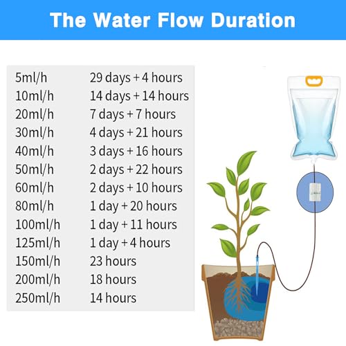 | Features | 【Automatisches Bewässerungssystem für Urlaubspflanzen】 Ein 3,5-Liter-Wasserbeutel kann etwa 3–20 Tage lang verwendet werden. Da er über ein präzise einstellbares Steuerventil verfügt, kann die Wasserdurchflussgeschwindigkeit gesteuert werden. Der Support Drip kümmert sich um die Pflanzen für die Dauer Ihres Urlaubs., 【Präzise Einstellung des Tropfventils】 Das Einstellrad zur genauen Einstellung der Tropfgeschwindigkeit kann die Tropfgeschwindigkeit besser steuern und Ihre grünen Pflanzen richtig bewässern., 【Einfach zu installieren】 Sie benötigen nur 5 Minuten, um ein automatisches Bewässerungssystem zum Selbermachen herzustellen., 【Extra große Kapazität】 Der aus hochwertigen Materialien hergestellte langlebige Wasserbeutel kann 3,5 Liter Süßwasser speichern, fast 1 Gallone Wasser. Spart Ihnen die Zeit des wiederholten Wasserfüllens. Sparen Sie Wasser, verwenden Sie 70 % weniger Wasser als herkömmliche Sprüh- und Tropfköpfe., 【Breite Anwendung】 Passt für die Verwendung mit Zimmerpflanzen, Topfpflanzen, Hängekörben, Terrassenpflanzen, Schreibtischtöpfen, Hängepflanzen, Garten im Freien, zu Hause oder im Büro. |