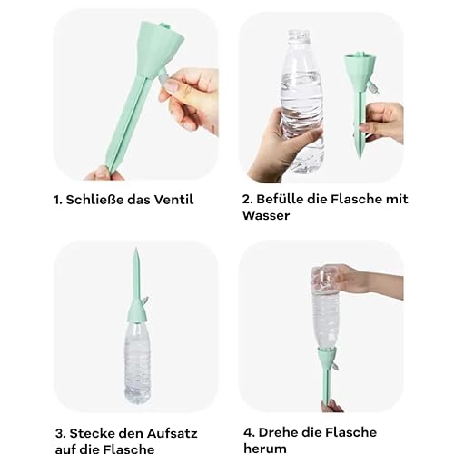 Features | EINSTELLBARE FLIEßRATE, Durch das Ventil kann die Tropfgeschwindigkeit 5-20 s / 1 Tropf kontrolliert werden. Ideal für eine Geschäftsreise oder Urlaub, PASSEND FÜR 1 LITER FLASCHEN, Der Aufsatz wird auf die volle Flasche gesteckt, dann die Flasche herumgedreht und anschließend in die Erde gesteckt. Optimal für das Gewächshaus, Garten, Balkon oder Beet, PERFEKT FÜR DEN URLAUB, Wenn sie vereisen, können Sie optimal die Pflanzen mit unserem System bewässern ohne diese gießen zu müssen, BESTE QUALITÄT, Der Aufsatz besteht aus hochwertigem Kunststoff. Dieser ist extra verstärkt und sorgt langfristig für top Ergebnisse in der Bewässerung Ihrer Pflanzen, 100% ZUFRIEDENHEIT GARANTIE, Sicherer Kauf und eine effektive Bewässerung für ihre Pflanzen! Wenn Sie Fragen zu dem Bewässerungs-Set haben, können Sie uns jederzeit kontaktieren |