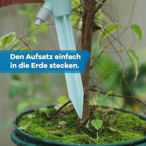 Die Installation dieses Bewässerungssystems ist kinderleicht und erfordert keine speziellen Werkzeuge. Du kannst das Gerät einfach auf eine Flasche aufsetzen, diese umdrehen und im Boden deiner Pflanze platzieren.