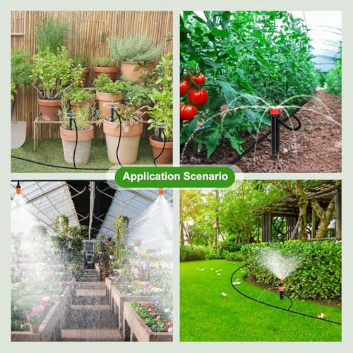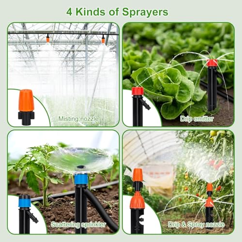 | Features | 240FT Tropfbewässerungskit: Das Bewässerungskit enthält 40 Fuß (ca. 12,2 m) Hauptschlauch (1/2") und 200 Fuß (ca. 61 m) Verteilschlauch (1/4"). Es umfasst insgesamt 136 Teile, und wir bieten genügend Zubehör, um zwei Tropfbewässerungssysteme aufzubauen., Das neue Design des Gartenbewässerungssystems mit einem 4×6-Wege-Verteiler kann das Wasser auf bis zu 16 Nebenstränge aufteilen, wodurch der Wasserdruck effektiv erhöht wird. Es löst perfekt das Problem des Wassermangels am Ende des Bewässerungssystems., Bis zu 85 % Wasserersparnis: Dieses automatische Bewässerungskit sorgt für eine effiziente Bewässerung aller Pflanzen, Bäume und Blumen. Es kann bis zu 23 Quadratmeter (250 Quadratfuß) abdecken, wenn Sie ein einzelnes System aufbauen, oder zwei Bereiche von jeweils 11 Quadratmetern (120 Quadratfuß), wenn Sie zwei separate Systeme erstellen., 4 Arten von Sprühern: Wir bieten 4 verschiedene Sprüher, um den Wasserfluss anzupassen. Enthalten sind: 10 Tropfsprüher (2-in-1-Düse), 10 Tropfstrahldüsen, 10 Tropfwirbeldüsen und 20 Nebeldüsen., Das automatische Bewässerungskit ist ideal für die Zerstäubung, Rasenbewässerung, Terrassen, Dachkühlung, Landwirtschaft, Gemüsegärten, Gewächshäuser, Blumenbeete sowie zur Nebelkühlung rund um Schwimmbecken und vieles mehr. |