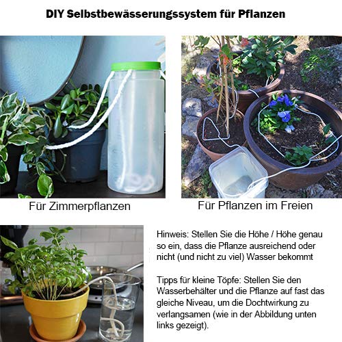 | Features | DIY AUTOMATISCHES BEWÄSSERUNGSVIERTEL-BEWÄSSERUNGS-SYSTEM: setzen Sie das eine Ende zu einer Wasserquelle, dieser Bewässerungsdocht saugt automatisch Wasser zum anderen Ende und Tropfen innerhalb 15 Minuten (die praktische Zeit hängt von der Länge des Seils ab, das Sie abschneiden; machen Sie dieses Baumwollseil vollständig in Wasser eingeweicht vor Gebrauch dann wird es sofort tropfen). Einfach, ein DIY automatisches Bewässerungsgerätesystem zu machen, hilft Ihnen, Ihre Anlagen zu pflegen., EIN WIRTSCHAFTLICHER & EFFEKTIVER SELBSTBEWÄSSERUNGS-WASSERER: einfach, ein ökonomisches und effektives Selbstwasser zu machen, NIEMALS SORGFÄLTIG, dass es zerbrechlich leicht bricht, oder schwer wiederzufüllen, oder mit Erde leicht verstopft wird, oder nicht genug Wasser hält, ein Ideal Alternative zur Bewässerung der Kugel, Bewässerung Globen, Glas Bewässerung der Zwiebeln, Bewässerung Pfahl und Terrakotta Bewässerungsspitze. KEINE Notwendigkeit, den Winkel zu pflegen,um es in Erde zu tauchen., EINFACH ZU PASSEN & KONTROLLIEREN & WASCHBAR FÜR WIEDERHOLBAREN GEBRAUCH: Sie können jeden Wasserbehälter auswählen, NIEMALS SORGFÄLTIG, um eine passende Flasche zu finden, besonders wenn Sie einen schönen finden, der zu Ihrem Pflanzer und Ihrer Pflanze passt. Sie können die Lautstärke und Zeit des Abtropfens steuern, indem Sie eine geeignete Wasserbehältergröße wählen. Das Wassertropfen ist stabil, KEINE SORGE, dass man entweder verstopft wird und kein Wasser austritt., PRÄZISE & EINFACHE BEWÄSSERUNG HART ZU REICHEN: Das Seil ist flexibel einstellbar, so dass es so einfach ist, Wasser zu Wurzeln und Erde zu bringen und nicht überall mit Tropfen. so leicht, in den überfüllten Pflanzenbereich zu gelangen, ideal zum Bewässern von schwer erreichbaren Bodenstellen, eine perfekte Lösung, um die Pflanzen dort zu halten, wo sie schwerer zu erreichen sind., GRÖSSE & 90-TAGE GARANTIE: 15m lang, 6mm Durchmesser. Ersatz oder Erstattung sind gedeckt. Es ist perfekt für DIY-Selbstbewässerung Gerät, Selbstbewässerung Tropfbewässerung Waterer, Indoor-Anlage Bewässerungsgerät System, Urlaub Pflanze Waterer, Urlaub Pflanzenbehandlung, Urlaub Pflanze Bewässerungssystem und automatische Waterer für Pflanzen, automatische Bewässerung Tropf Kit und selbst Bewässerung Pflanzer Topf. |