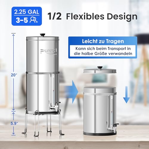 Das Purewell 6-stufige Schwerkraft-Wasserfiltersystem bietet dir sauberes Wasser ohne Strom. Mit langlebigem Edelstahl und effektivem Filter sorgt es für frisches Trinkwasser zu Hause oder beim Camping – ideal für Outdoor-Abenteuer!