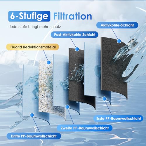 - Sechsstufige Filtration einschließlich Aktivkohleblock und Fluorid-Reduktionsmembran