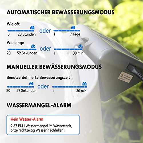 Die Möglichkeit, die Bewässerungsdauer von 20 Sekunden bis 30 Minuten anzupassen, ermöglicht eine präzise Kontrolle, was für die Gesundheit der Pflanzen entscheidend ist und langfristig Kosten spart.