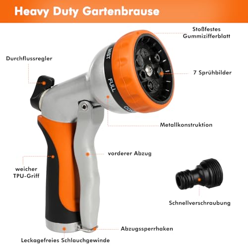 Die RESTMO Gartenbrause bietet dir 7 Sprühmuster und einen einstellbaren Wasserdurchfluss. Hergestellt aus robustem Metall, ist sie ideal für die Gartenbewässerung und Autowäsche. Ergonomisches Design sorgt für Komfort bei der Anwendung.