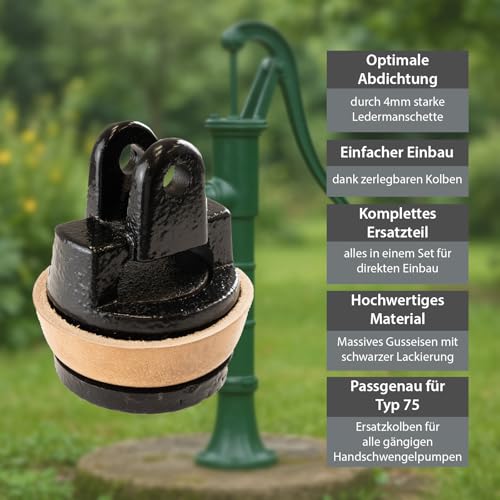 | Features | Die klassische und umweltfreundliche Art zu pumpen, Passend für fast alle im Garten gängigen Handschwengelpumpen, Dichtung aus echtem, 4 mm starkem Leder, Geeignet für einen Pumpendurchmesser von 75 mm, In Einzelteile zerlegbar |