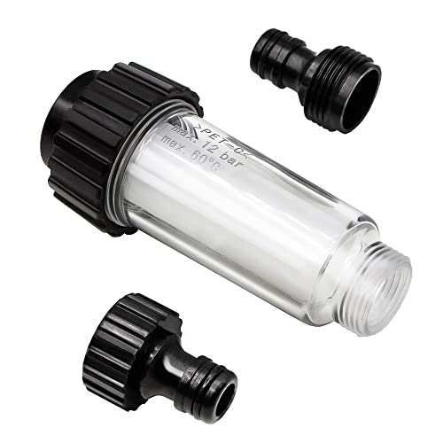 | Features | EINSATZGEBIETE: Wasserfilter zum Einsatz an einem Hochdruckerreiniger oder anderen Geräten im Garten, Haushalt oder Wohnmobil, die vor verunreinigtem Wasser geschützt werden sollen, OPTIMALER SCHUTZ: Idealer Schutz Ihrer Geräte bei der Wasserentnahme aus verunreinigten Wasserquellen wie Brunnen, Tonnen, Leitungen und Gewässern ab einer Teilchengröße von 0,25 mm, KOMPATIBILITÄT: Kärcher 4.730-059.0 und den Hochdruckreinigerserien K2 K3 K4 K5 K6 K7, sowie Nilfisk 128500674 u.v.m, EIGENSCHAFTEN: 3/4" (24,12 mm) Innengewinde x 3/4" (26,44 mm) Außengewinde / max. 12 bar / max. 60°C, LIEFERUMFANG: 1 Wasserfilter |