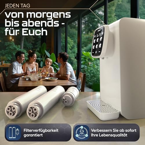 | Features | 𝙃ö𝙘𝙝𝙨𝙩𝙚 𝙌𝙪𝙖𝙡𝙞𝙩ä𝙩 𝙛ü𝙧 𝙝ö𝙘𝙝𝙨𝙩𝙚 𝘼𝙣𝙨𝙥𝙧ü𝙘𝙝𝙚 – Die integrierte 𝙃𝙍𝙋-Technologie (𝙃𝙞𝙜𝙝𝙍𝙚𝙫𝙚𝙧𝙨𝙚𝙋𝙧𝙚𝙘𝙞𝙨𝙞𝙤𝙣) der VILTARO Umkehrosmoseanlage filtert nahezu alle Schadstoffe präzise aus dem Wasser, um Ihnen das wichtigste Element in Ihrem Leben zur Verfügung zu stellen – reinstes Trinkwasser. Ein 𝙉𝙖𝙩𝙪𝙧𝙨𝙩𝙚𝙞𝙣𝙛𝙞𝙡𝙩𝙚𝙧 zur Remineralisierung des Trinkwassers sorgt für die perfekte Wasserbalance und versorgt Sie so mit den wichtigsten Mineralien., 𝘼𝙣𝙨𝙘𝙝𝙡𝙞𝙚ß𝙚𝙣. 𝘼𝙪𝙛𝙛ü𝙡𝙡𝙚𝙣. 𝘼𝙪𝙨𝙬ä𝙝𝙡𝙚𝙣. – Drei einfache Schritte zu reinstem Osmosewasser. Kein Bohren und Schrauben, die Anlage einfach an den Strom anschließen, Leitungswasser in den herausnehmbaren Wassertank füllen und Wasser in der gewünschten Temperatur entnehmen. Außerdem kann die mobile Wasserfilteranlage problemlos an verschiedensten Orten, ob in der Küche, im Büro oder auf Reisen, im Wohnmobil oder im Ferienhaus, aufgestellt werden., 𝙉𝙖𝙘𝙝𝙝𝙖𝙡𝙩𝙞𝙜𝙚 𝙉𝙪𝙩𝙯𝙪𝙣𝙜 – Als ein führender Hersteller für Premium Osmoseanlagen und Ersatzfilter bieten wir als einziges Unternehmen ein spezielles Recyclingprogramm an, damit Ihre Ersatzfilter alle Glieder der Kreislaufwirtschaftskette durchlaufen und wiederverwendet werden können. Durch die geschaffene Rückgabemöglichkeit können wir gemeinsam einen Beitrag leisten, den CO2–Fußabdruck bei jeder Verwendung zu minimieren., 𝙀𝙞𝙣𝙯𝙞𝙜𝙖𝙧𝙩𝙞𝙜𝙚 𝙁𝙪𝙣𝙠𝙩𝙞𝙤𝙣𝙚𝙣 – Das hochwertige Touch Display zeigt Ihnen den TDS-Wert und die Wassertemperatur. Außerdem verpassen Sie keinen Filterwechsel mehr, dank automatischer Anzeige. Zu Ihrer Sicherheit lässt die Kindersicherung keine unbeabsichtigte Heißwasserentnahme zu. Zudem können Sie zwischen sechs Temperaturstufen wählen und mit gefiltertem Heißwasser können Sie besonders gut warme Speisen und Getränke zubereiten, z.B. Babynahrung und Porridge oder Tee und Kaffee., 𝙆𝙤𝙢𝙛𝙤𝙧𝙩 𝙩𝙧𝙤𝙩𝙯 𝙎𝙥𝙖𝙧𝙚𝙣 – Neben dem lästigen Kistenschleppen kommt in einem 1-Personen-Haushalt für den Kauf von Mineralwasser schnell ein Betrag von 800 Euro pro Jahr zusammen. Mit dem Komfort reinstes Trinkwasser direkt bei sich zuhause zu erzeugen, sparen Sie also nicht nur Zeit, sondern auch noch Geld. Außerdem tragen Sie aktiv zur CO2 Reduzierung bei, denn lange Transportwege und das Abfüllen von Mineralwasser in Plastik- oder Glasflaschen werden überflüssig. |