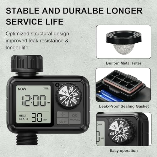 | Features | SMART TIMING:Mit dem Xtsuen Bewässerungstimer können Sie Ihren Bewässerungszeitplan genau anpassen. Sie können Ihren Bewässerungstimer so einstellen, dass er von 1 Minute bis 240 Stunden, 1-23 Stunden oder 1-15 Tage bewässert, um eine präzise Anpassung zu ermöglichen., MANUELLER MODUS:Manuelle Bewässerung Modus ermöglicht eine schnelle und flexible Bewässerung von jedem Rasen oder Garten nach Bedarf. Regenverzögerung, langes Drücken von ok für 2 Sekunden kann Ihnen helfen, den nächsten Bewässerungszyklus schnell zu verzögern, bequem und einfach, Wasser zu sparen., LCD-DISPLAY:Die Zeitschaltuhr ist mit einem LCD-Display ausgestattet, auf dem Sie Details wie Bewässerungszeit, Bewässerungshäufigkeit, verbleibende Leistung usw. deutlich ablesen können. Dank der Wasserdichtigkeitsklasse IPX5 sind Sie sowohl vor Wasserströmungen als auch vor Regenwetter geschützt, so dass sie perfekt für eine Vielzahl von Außenanwendungen geeignet ist., REICHHALTIGE EINSATZSZENARIEN: Einzelne Schlauchbewässerung mit Uhr ist eine gute Wahl für Ihren Garten, Rasen, Hof. Helfen Sie Ihnen, den Rasensprenger, den Gewächshaussprenger, die Schwimmbadbewässerung zu steuern, um Ihre täglichen vielfältigen Bedürfnisse zu erfüllen., ENTHALTENE PRODUKTE:Timer*1 Bedienungsanleitung*1 Der Timer enthält einen Metall-Aluminium-Filter, mit dem Sie Sedimente herausfiltern können. Das Produkt benötigt 2*1,5V Alkalibatterien. (nicht enthalten), 🤝Dieser Bewässerungstimer benötigt Wasserdruck und ist nicht für Regentonnen geeignet. |